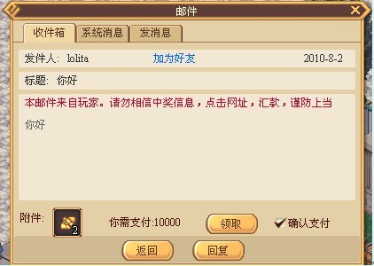 玩家在收到付费邮件时,确认邮件中物品数量,需支付服用数量无误后,勾选确认支付选项方可完成付费取信操作。