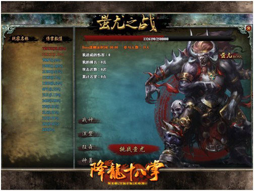很好推的除了萝莉,还有世界BOSS!7k7k《降龙十八掌》首部资料片新增世界BOSS玩法,大家每天可以在每天的15:30-16:30内,通过游戏内的活动界面参加到推倒世界BOSS的战役中来。推倒蚩尤可获得大量的铜币、劫、征战令、武魂、名望、金币、和其他高级道具!