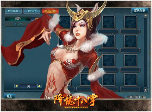 大家进入家族界面后,点击新增的家族仓库按钮可以进入仓库界面。参加家族战和阵营战可以获得家族战利品存放在仓库内,族长与副族长有分配战利品的权利。