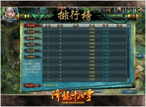 在7k7k《降龙十八掌》首部资料片新增的排行榜中,大家可以查看到等级、名望、家族、击杀、星级、武魂等不同排行。而且在排行榜里不仅可以查看自己的排名,还可以通过该功能更进一步了解到高手们的现况。高手们都在用什么装备、怎么排兵布阵再也不是秘密!