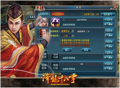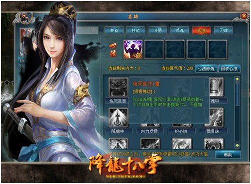 主英雄和副英雄都可以通过心法修炼面板来修炼心法,每个心法最多可以修炼到九重,心法等级越高威力越大。同时心法可以被回收为真气,真气可以通过真气灌输功能以修炼值的方式重新灌输到其他心法中去。