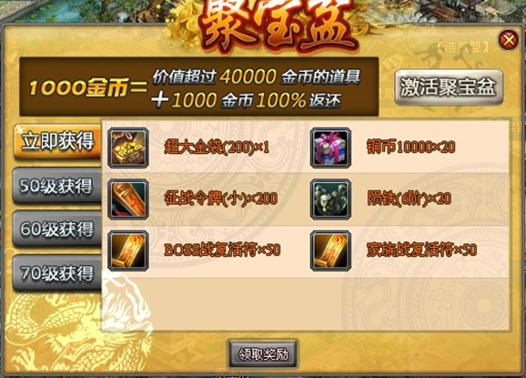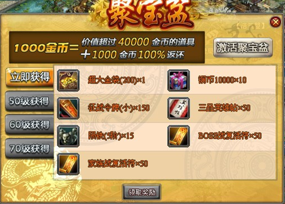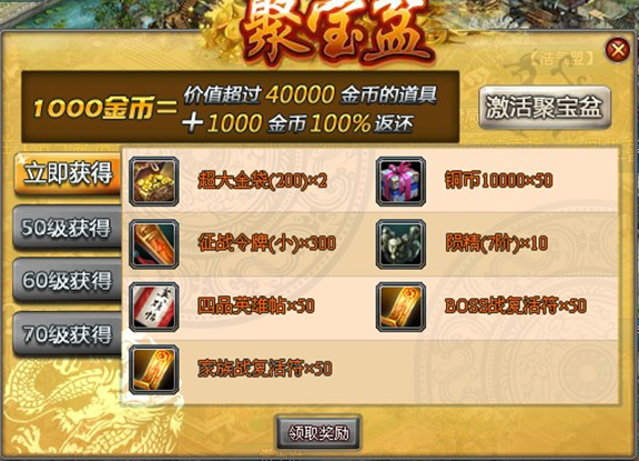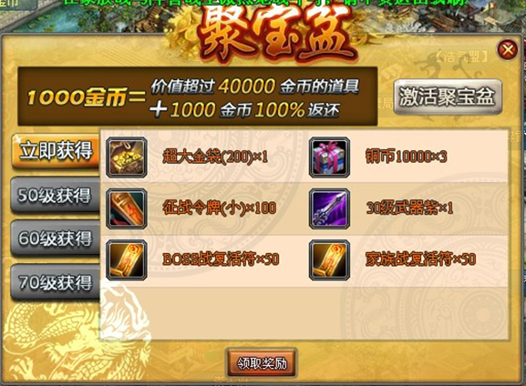 70级领取:400金币,富甲天下(1万铜币)*50、征战令x300、7阶陨精x10、四品英雄帖x50、BOSS战复活符x50、家族战复活符x50