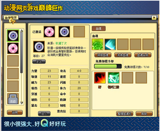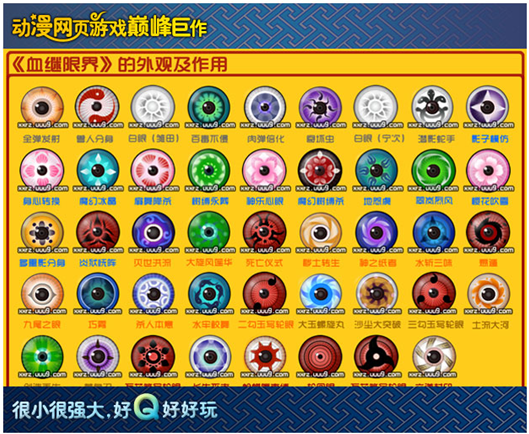 萝卜青菜各有所爱,7k7k《小小忍者》此番提供了充分选择的舞台!越过40种的血继限界可供选择,但是每次可以同时使用的只有3种。唯有主眼的奥义可以被激活而副眼仅以属性增加的方式存在,因此配合自己的属性设定主眼以及2个副眼变的格外重要。选择和人物属性所向适应的主眼以及副眼成为玩转血继系统的重中之重!