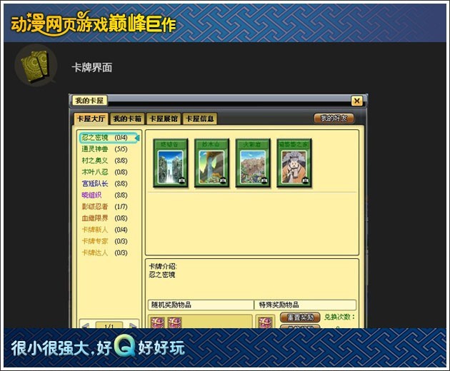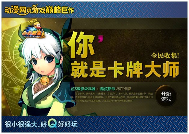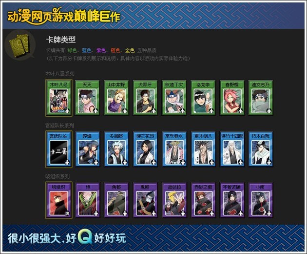 如今,7k7k《小小忍者》带你重温卡牌收集的乐趣,全新卡牌收集玩法即将亮相,木叶八忍、静灵庭十三番小队、晓组织、血继限界……等等等,让无数漫迷为之痴狂的经典动漫元素,将借助卡牌的力量再次登场!