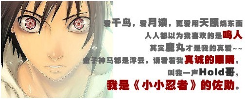 “爱千鸟,爱月读,更爱用天照烧东西,人人都以为我喜欢的是鸣人,其实鹿丸才是我的真爱~~金子神马都是浮云,请看着我真诚的