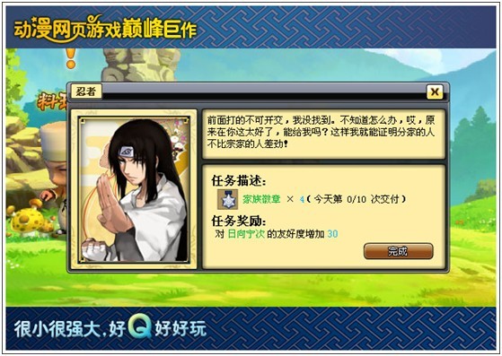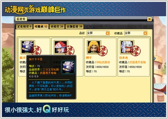 宇智波佐助、旗木卡卡西、漩涡鸣人、纲手姬……众多著名忍者将在小忍的世界中出现,,小忍们可以通过每日任务,收集他们喜欢的道具,并以此增加友好度。当友好度达到要求之后,就能继承他们所独有的血继力量。