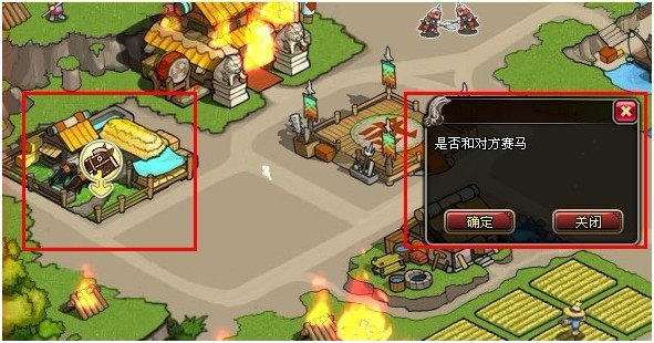 点击你要掠夺玩家封地中的马厩,即会弹出是否与其赛马的提示,点击确定及可进行赛马。