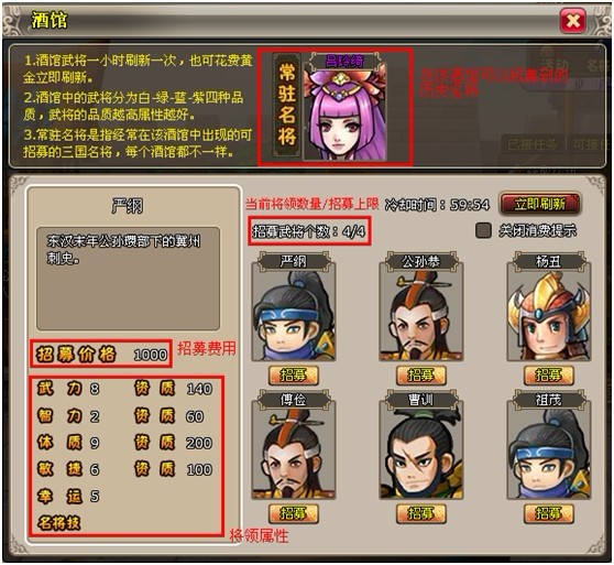 2. 酒馆同时会有六个武将供选择,每一小时自动刷新一次,可以使用黄金立即刷新。