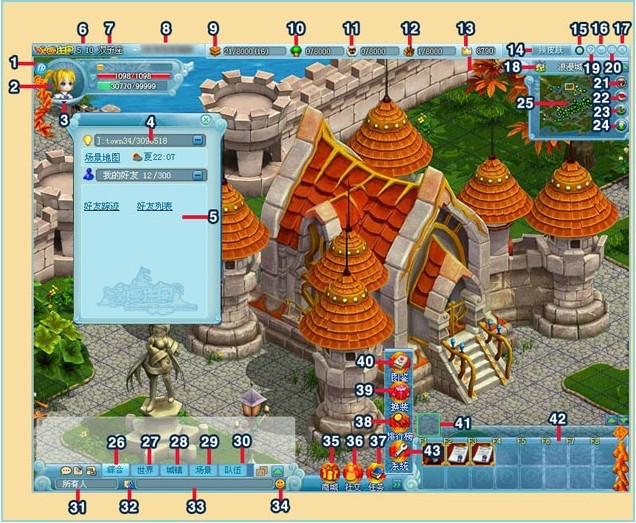 | 25 | 小地图:点击小地图或者拖动黄颜色的方框可预览当前场景。在庄园里,小地图四个方向有四个相应的小箭头,点击箭头,快速访问所处庄园的左邻右舍 |