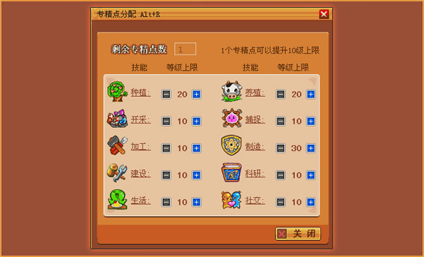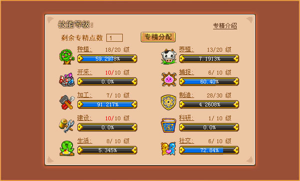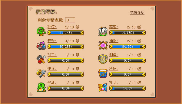在浪漫庄园里共有10种技能(种植、养殖、开采、捕捉、加工、制造、建设、科研、生活、社交),最初的技能升级上限为10。如果想要进阶其中一项技能的话,就需要专精点数来进行增加。1个专精点数可以提高10级上限。(科研技能暂未开放)