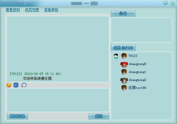 查看资料:可以查看家族的基本信息:名称、管理员、总评价、公告、简介