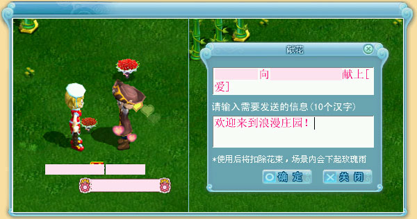 输入赠送内容后,点击[确定]即可发出世界频道消息,并且场景内下玫瑰雨。