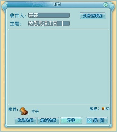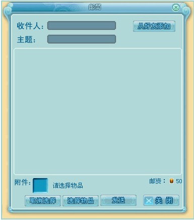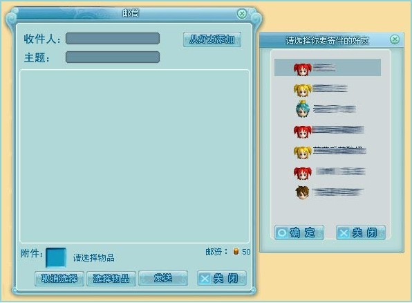 点击寄邮件后,进入发送邮件页面,填上收信人昵称,收信人的昵称可以冲好友列表里添加,昵称框后面的【从好友添加】就可以跳出好友系统,点击好友的名字,就可以了。