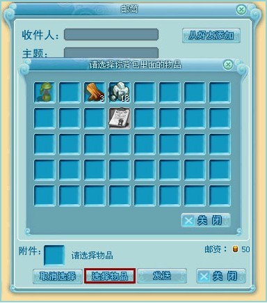 同样,邮件邮寄附加物品的时候,也可以从您的背包中添加,点击物品框后面的【选择物品】 ,就可以看到自己背包里的所有物品,点击选择您想邮寄给对方的物品,该物品就会自动放入邮箱的物品框中去了,不过每次只能邮寄一项物品。
