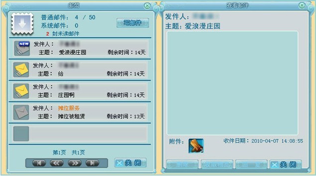 打开邮筒,可查看其中储存的邮件。普通邮件容量50封,超过50封的邮件将无法收到,请大家多多留意邮件信息,以免错过邮件哦。