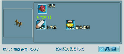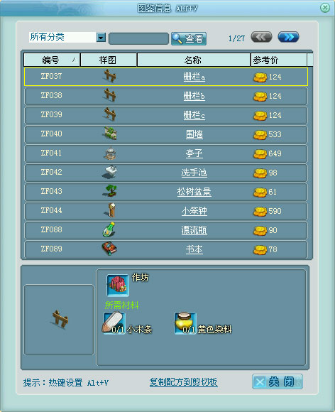图鉴显示区的内容为配方或者素材图册,条目内容分别是配方编号(工具的缩写和序号)、产品样图(右键点击可查看详细介绍)、配方名称、参考价格。选择了某个配方后会在图鉴下部显示出该配方的详细内容,包括产品的样图、名称、所需工具、所需材料,根据这些提示就可以进行相关物品的制造了。