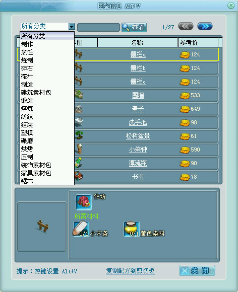在图鉴里包含了制造秘籍、烹饪菜谱、酿酒酒谱、建筑素材、家具素材、装饰素材等多种类型。制造秘籍根据工具分成14种类型。可以根据图鉴的类型进行检索,或者在搜索栏处直接搜索合成配方或者图册、菜谱和酒谱。
