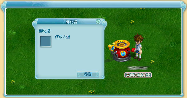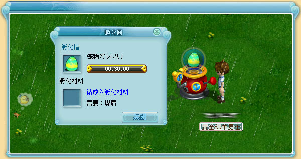 安装孵化器后,将宠物蛋放入宠物孵化器的孵化槽,会看到相应宠物蛋说需要孵化材料的提示,还有孵化宠物蛋消耗的时间槽。
