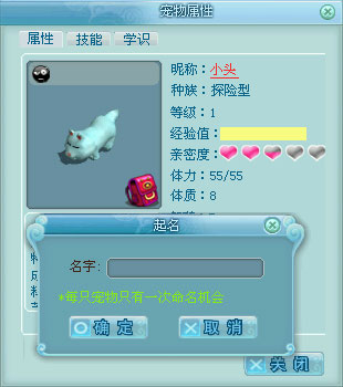在宠物属性的面板中,点击昵称“小考拉”处出现提示框,可以给它起个名字,每只宠物的名字只有一次重新命名的机会。