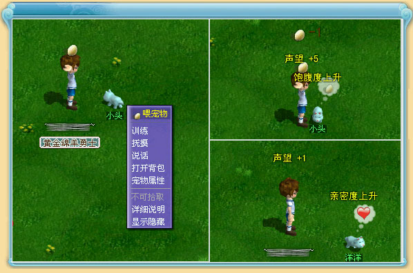 宠物都有自己喜欢吃的食物和讨厌吃的食物,如果给宠物喂食喜欢的食物,它就会很高兴,可以增加亲密度,每次均增加1点亲密度,直至不再吃。需要注意的是,5分钟之内喂食多次其他食物,也只累积一次亲密度。如果喂食了讨厌的食物,则会减亲密度,每喂一次减一点亲密度。
