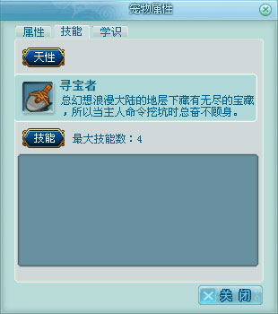 宠物技能分为天性和技能,而技能又根据宠物的种族分为三种技能。相应的种族只能学会对应的技能,而有一些大众型的宠物技能是各个种族都可以学习的。