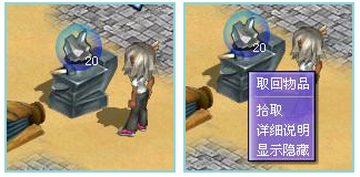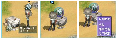 然后把所需要加工的岩石矿,放到碎石台上面。鼠标移到碎石台上会出现“加工”提示。点击左键后,角色会把岩石矿放置到碎石台上。放置好后,碎石台上会出现浮动的岩石矿并显示岩石矿的数量。如果想取下岩石矿,用鼠标右键点击岩石矿就会出现菜单,选择取回物品后,放在碎石台上的岩石矿就会自动回到背包里面。