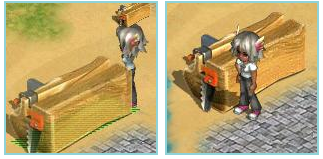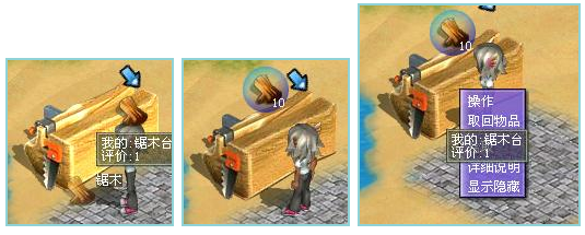 然后把所需要加工的木头,放到锯木台上面。鼠标移到锯木台上会出现“锯木”提示。点击左键后,角色会把木头放置到锯木台上。放置好后,锯木台上会出现浮动的木头并显示木头的数量。如果想取下木头,用鼠标右键点击木头就会出现菜单,选择取回物品后,放在锯木台上的木头就会自动回到背包里面。