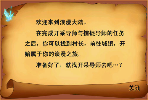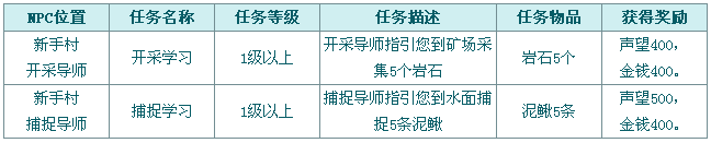 您建立好角色,进入游戏,会出现在新手村,您需要在新手村完成新手任务。 新手任务需要做两项。两项任务完成后就可以离开新手村。 开采导师指引您到矿场采集5个岩石 捕捉导师指引您到水面捕捉5条泥鳅