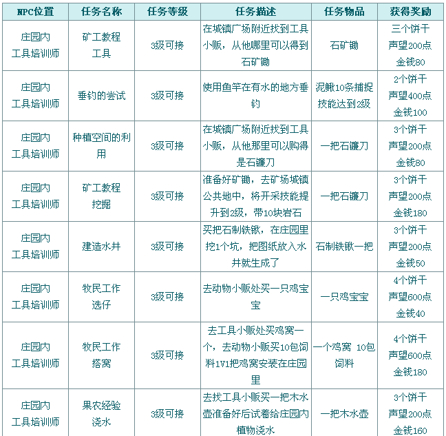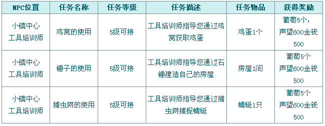 两项任务做完,你会得到一些金钱以及工具木鱼竿和石矿锄和新手声望卡。就可以离开新手村了。首先必须找城镇执行官 申请公民。否则无法入住庄园。 入住庄园后工具培训员会提示你到城镇执行官那里去报告、报告后就可以回到自己的庄园内找工具培训员(NPC)领取任务。