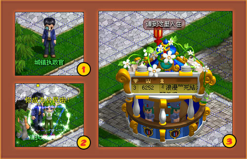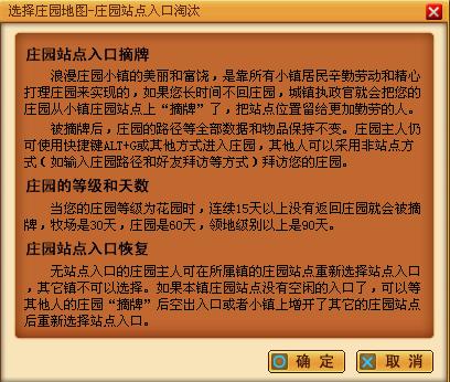 任务交还:点击自己庄园中的路标,或者ALT+M打开世界地图画面,返回自己所在的小镇(红色为自己入住的小镇,蓝色为其他小镇,黄色为大型城镇{不可入住}),回到城镇执镇官处,与之对话,选择入住庄园完成,在选择提交任务,得到奖励饼干2块,声望200.