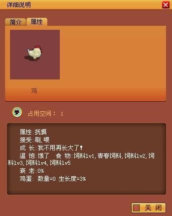 7、好棒,鸡宝宝终于长大了,额~好丑的鸡啊,这个时侯你可以用鼠标右键点击鸡,然后选择详细说明,在里面可以详细看到鸡的状态哦